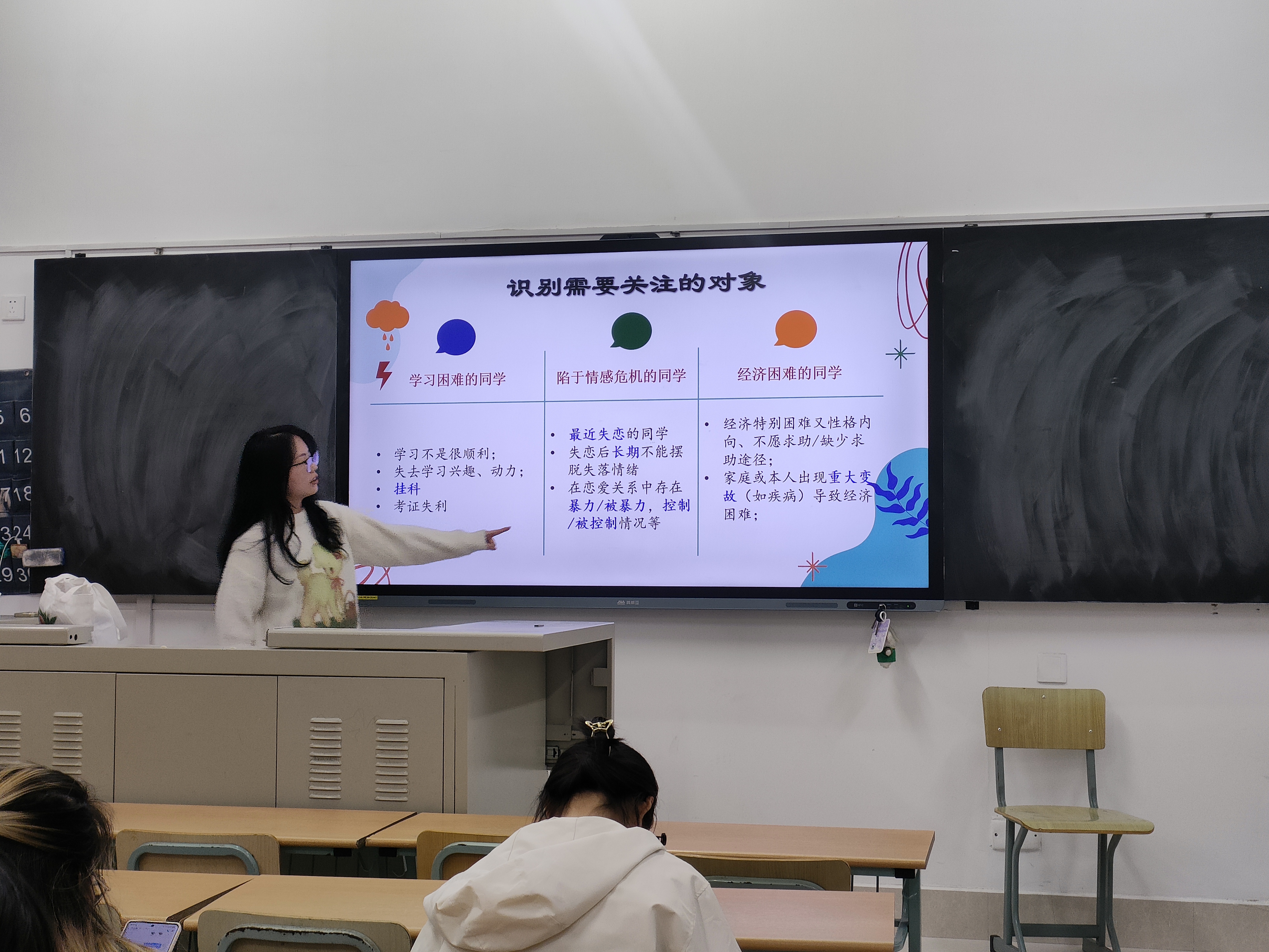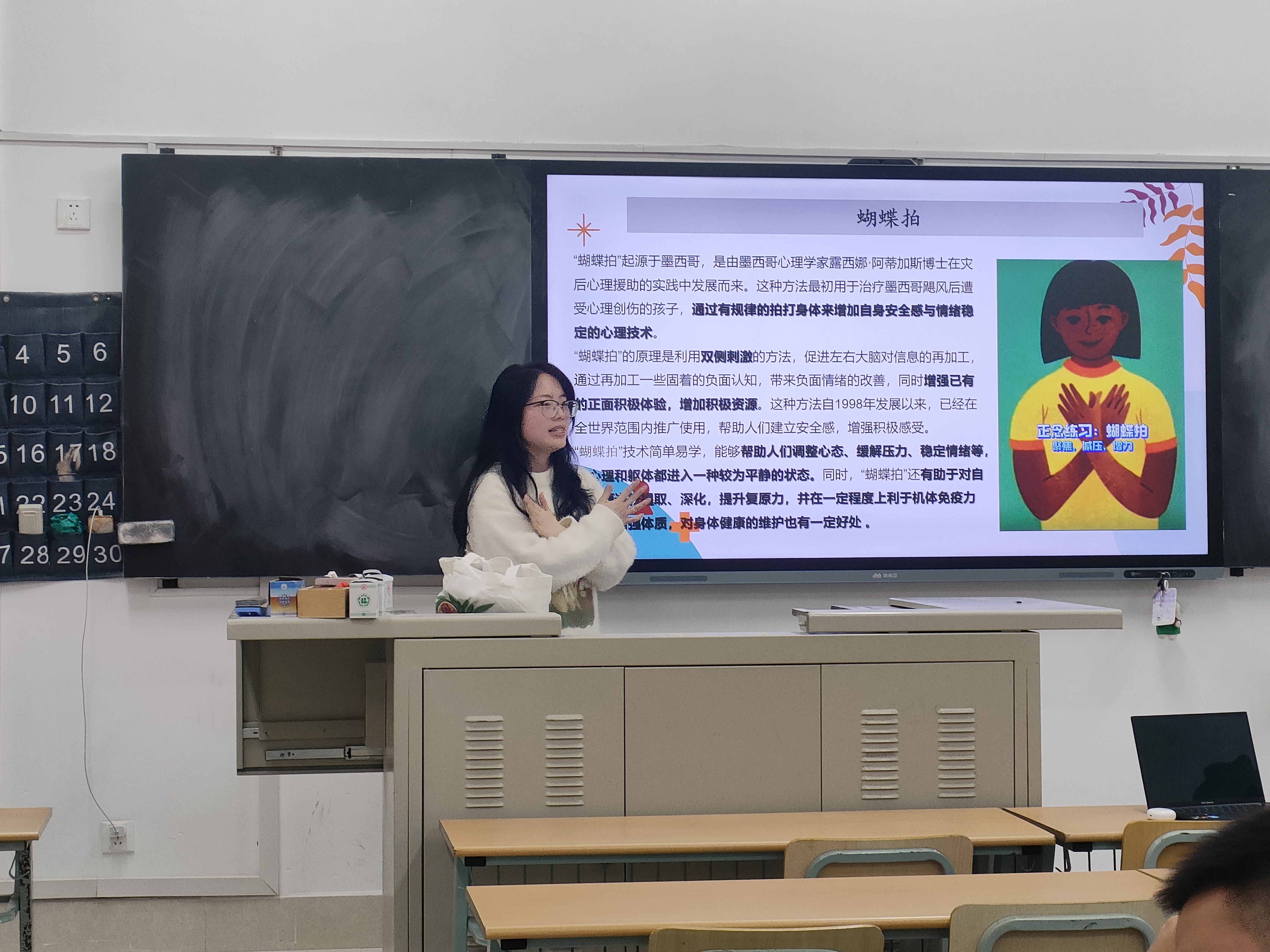 在培训过程中,她通过一系列互动环节,引导学生骨干们认识到心理健康问题的多样性和复杂性,并讲授了如何识别需要关注的心理健康问题,包括学习困难、情感危机和经济困难等。此外,还分享了一些有效的沟通技巧、安慰方法,如“万能安慰公式”、“尊重-倾听-共情”等,以及几种实用放松技巧,如“蝴蝶拍”技术、呼吸放松法、安全岛、保险箱技术等