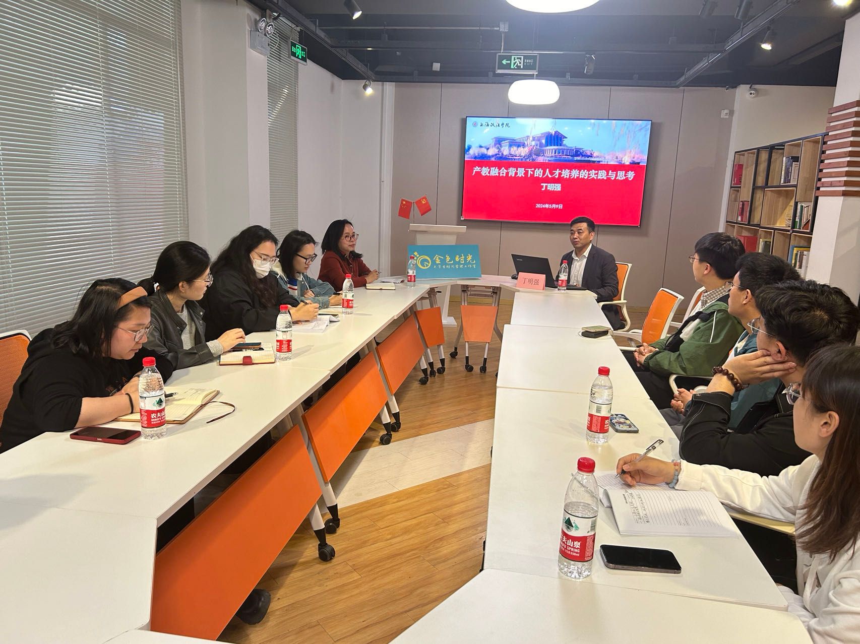 为进一步提升辅导员思政工作队伍研究能力,不断强化辅导员队伍建设,5月9日下午,金色时光工作室邀请了上海政法学院经济管理学院党委副书记丁明强在易班体验中心开展主题为“推进产教融合、以赛促学人才培养的实践与思考”的专题沙龙讲座,本次活动由金色时光工作室负责人、化工学院党委副书记、副院长钱婷婷主持,学工部辅导员队伍建设与管理办公室主任洪月娥以及工作室全体成员、部分辅导员、学生代表共同参与。