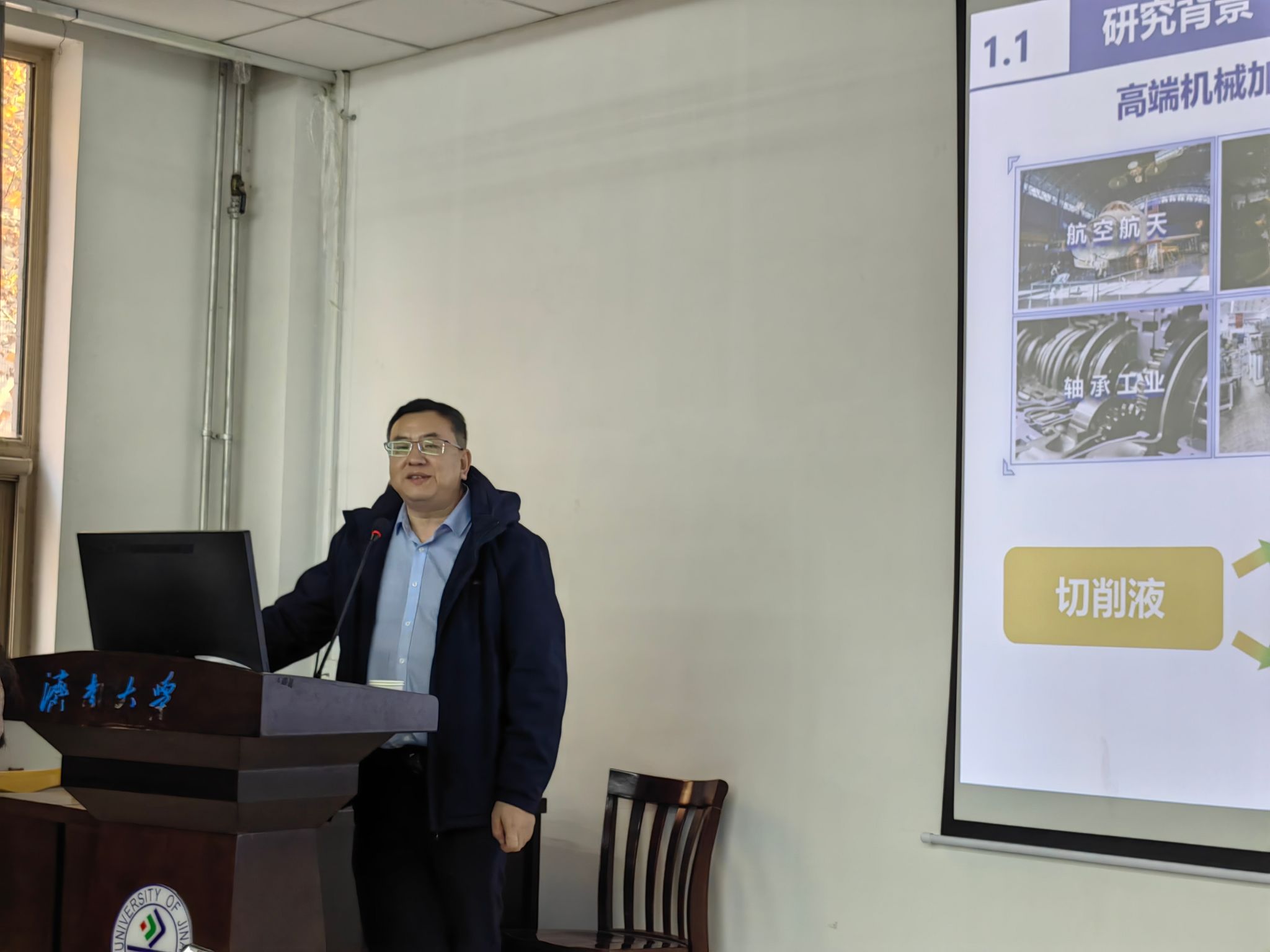 济南大学化学化工学院相关专业教师、研究生80余人参加报告会并参与交流活动。韩生教授作了题为“磁/pH响应的植物油基Pickering乳液切削液:制备、性能及油水分离效能研究”的学术报告。他指出,传统金属加工液存在润滑性能不足、易变质、环境污染大等问题,开发高效、环保的新型润滑冷却介质是绿色制造领域的迫切需求。韩生教授系统介绍了其团队在Pickering乳液这一新型稳定体系方面的创新工作。该研究利用固体颗粒(如纳米二氧化硅或功能性复合材料)作为乳化剂,替代传统的表面活性剂,成功构建了以植物油为基础相的Pickering乳液切削液。这种乳液不仅具有良好的生物降解性和较低的生态毒性,而且其独特的界面结构赋予了乳液优异的润滑性能和稳定性。