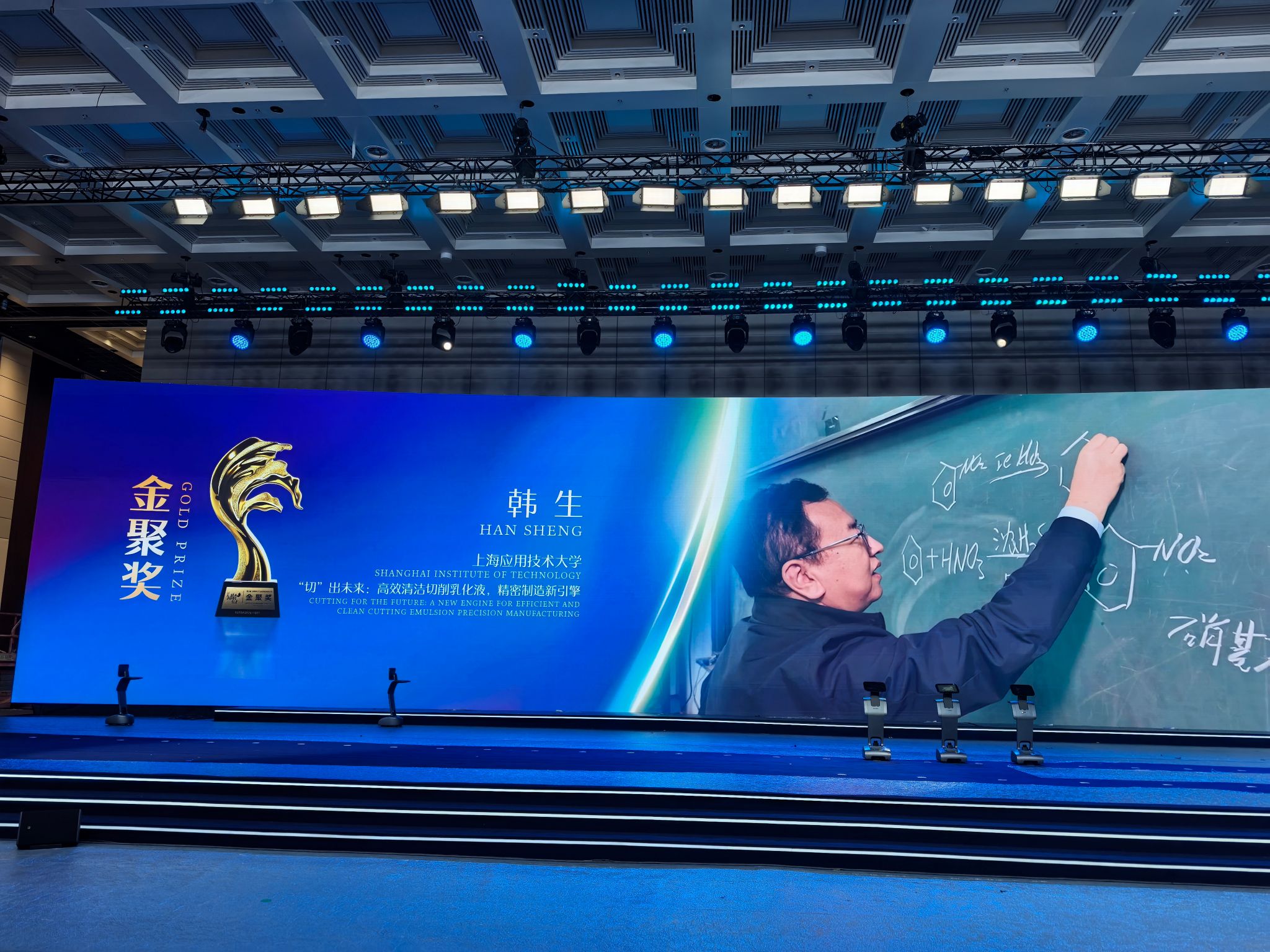 在这场高手如云的激烈竞争中,我校韩生教授领衔的“‘切’出未来:高效清洁切削乳化液,精密制造新引擎”项目,宛如一艘破浪前行的航船,凭借其突破性的技术成果和巨大的产业应用价值,从数千个参赛项目中强势突围,一举斩获大赛的最高殊荣——金聚奖。值得一提的是,该项目由奉贤区推荐参赛,它的获奖意义非凡,成为奉贤区在该项赛事中荣获的首个金奖,宛如一座闪耀的里程碑,标志着奉贤区在创新创业领域迈出了坚实而重要的一步。在颁奖环节,上海市委常委、常务副市长吴伟亲自为项目团队颁奖,这一庄重而温馨的举动,充分彰显了各级领导对该项目的高度认可与重视,也让现场气氛达到了高潮。