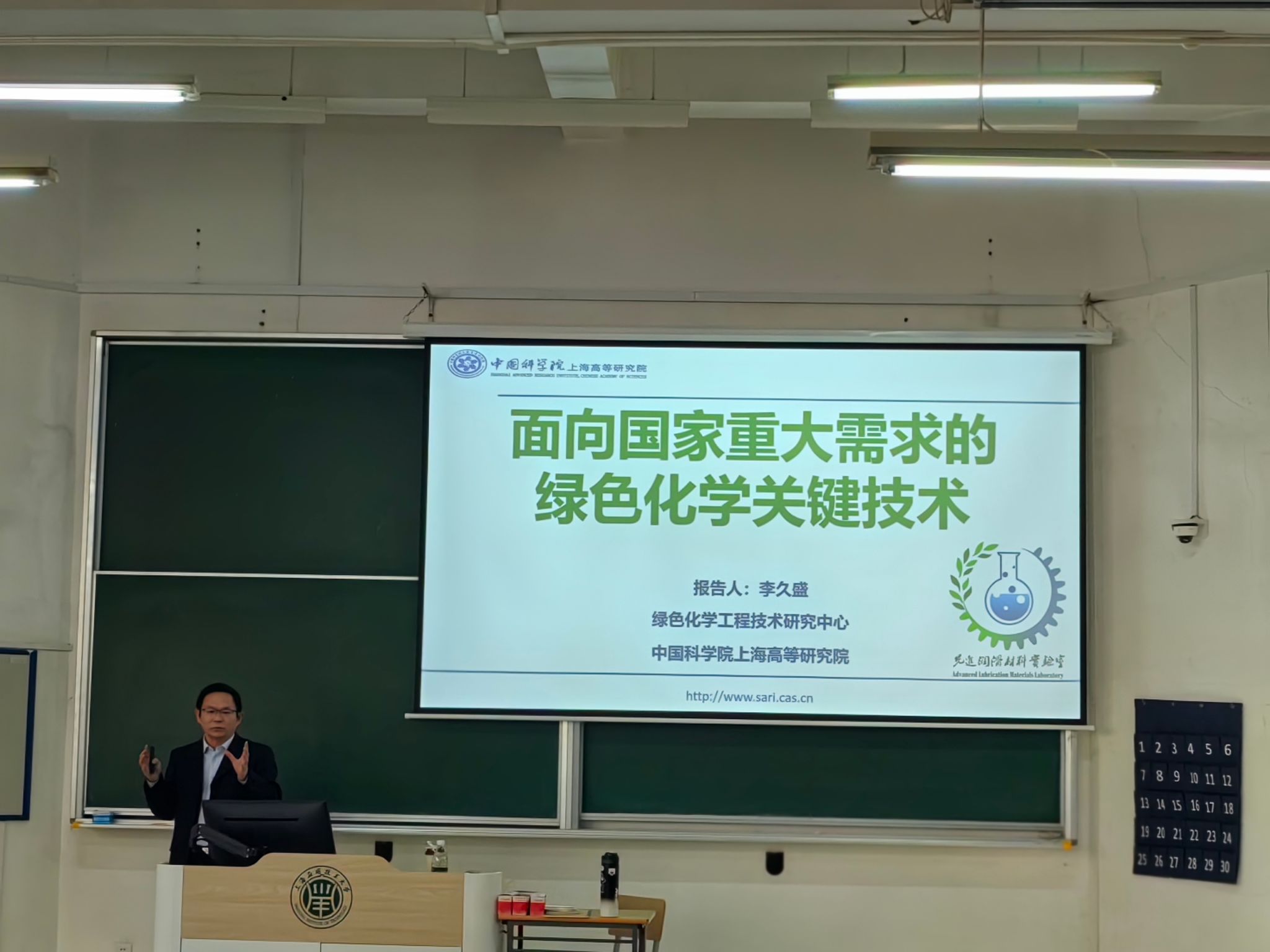 11月28日,中国科学院上海高等研究院绿色化学工程技术中心主任李久盛教授应邀为化工与能源技术学部研究生作题为《面向国家重大需求的绿色化学关键技术》的专题授课。本次授课是学部《研究生跨界创新能力培养》产教融合系列课程的重要组成部分,旨在深化校企协同育人机制,拓宽研究生学术视野,提升跨领域应用创新能力。