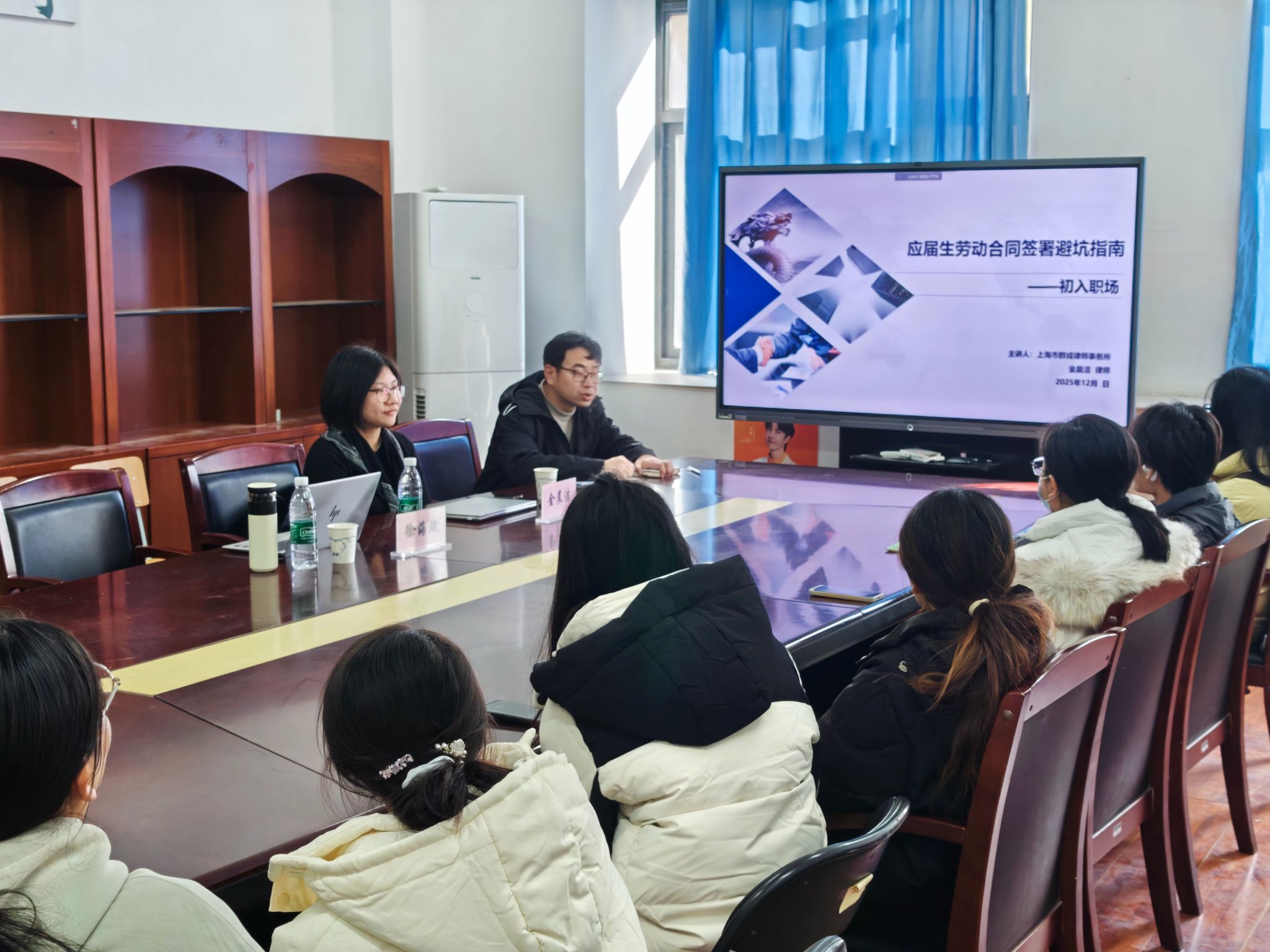讲座特邀资深劳动法律师金晨洁和徐海斌担任主讲。金晨洁结合多年实务经验,聚焦毕业生在求职阶段的困惑与潜在风险进行了深入浅出的剖析与讲解。内容紧密围绕劳动合同的核心要素展开,重点解读了合同主体信息确认、合同期限类型、工作岗位与地点、劳动报酬结构与支付、工作时间与休息休假、社会保险与福利待遇等关键条款的审查要点。针对实践中常见的“试用期规定不明”“违约金陷阱”等问题,金律师还通过典型案例分析,给出了具体识别方法与应对策略。徐海斌系统普及了与就业相关的基础法律知识,包括劳动关系的确立标准、劳动者的基本权利与义务、劳动争议的解决途径等,强调了签约前核实用人单位资质、仔细审阅合同文本、保留重要证据的重要性。