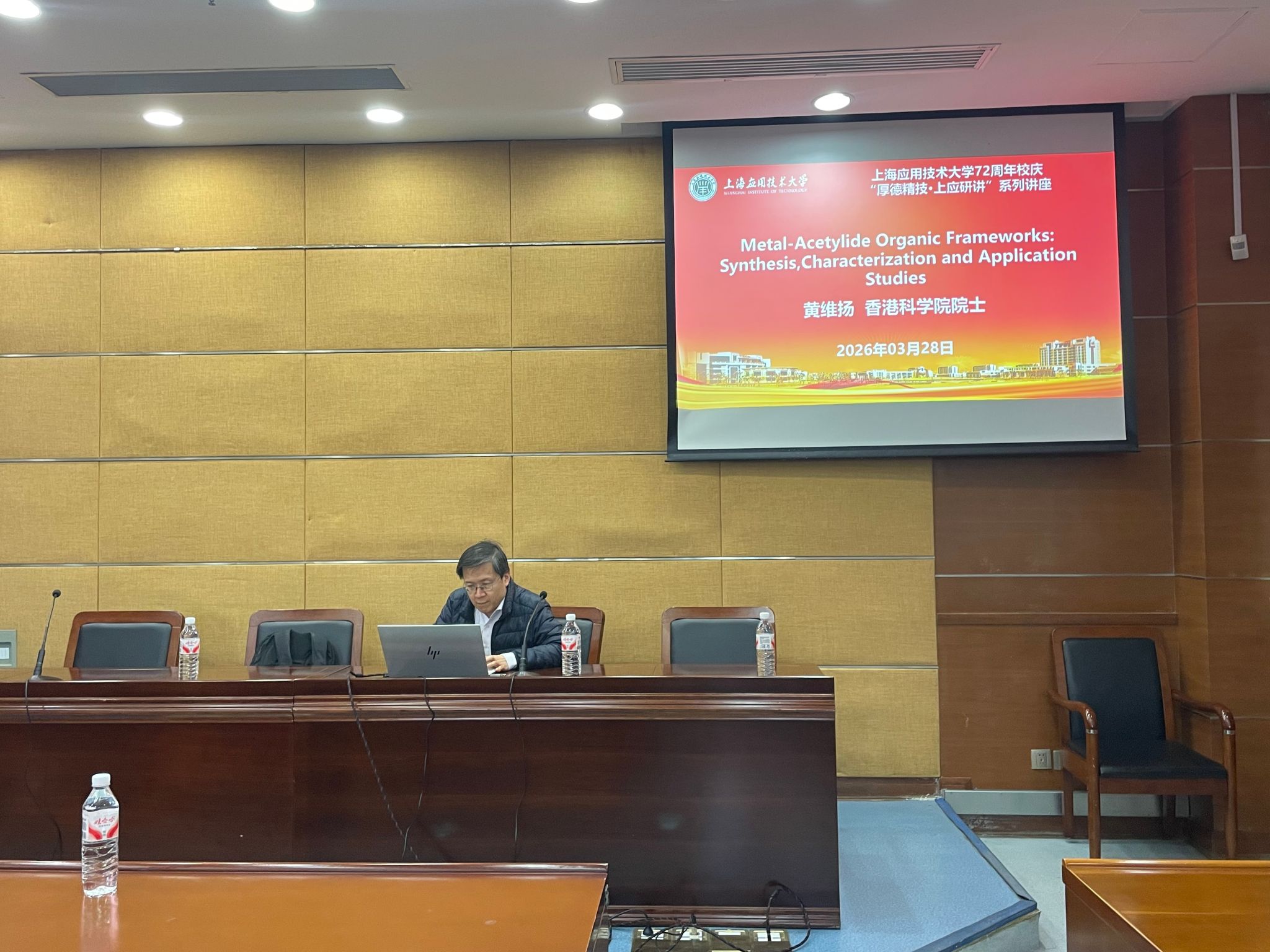 3月28日,香港科学院院士、香港理工大学黄维扬教授应邀来校作题为“Metal-Acetylide Organic Frameworks: Synthesis, Characterization and Application Studies”的学术报告,报告会由化工与能源技术学部邱丰副教授主持,相关研究领域的师生参加了报告会。