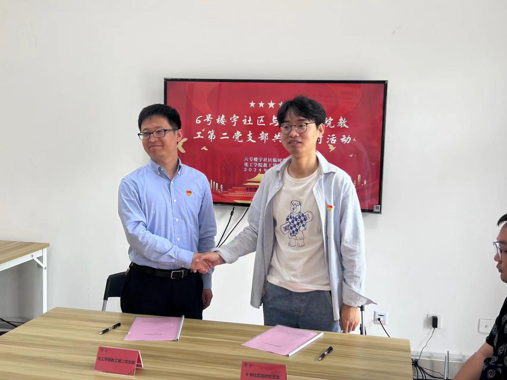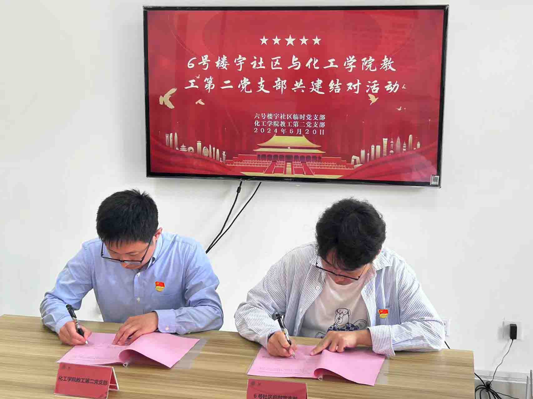 6号楼宇社区临时党支部与化工学院教工第二党支部在党建结对活动中签署了党建共建协议,共建双方将以加强基层党组织建设为目标,发挥结对双方的优势资源,实现资源共享、互帮互助,以共建促党建,稳步提高党员队伍整体素质,增强党组织的组织力、凝聚力和创造力。