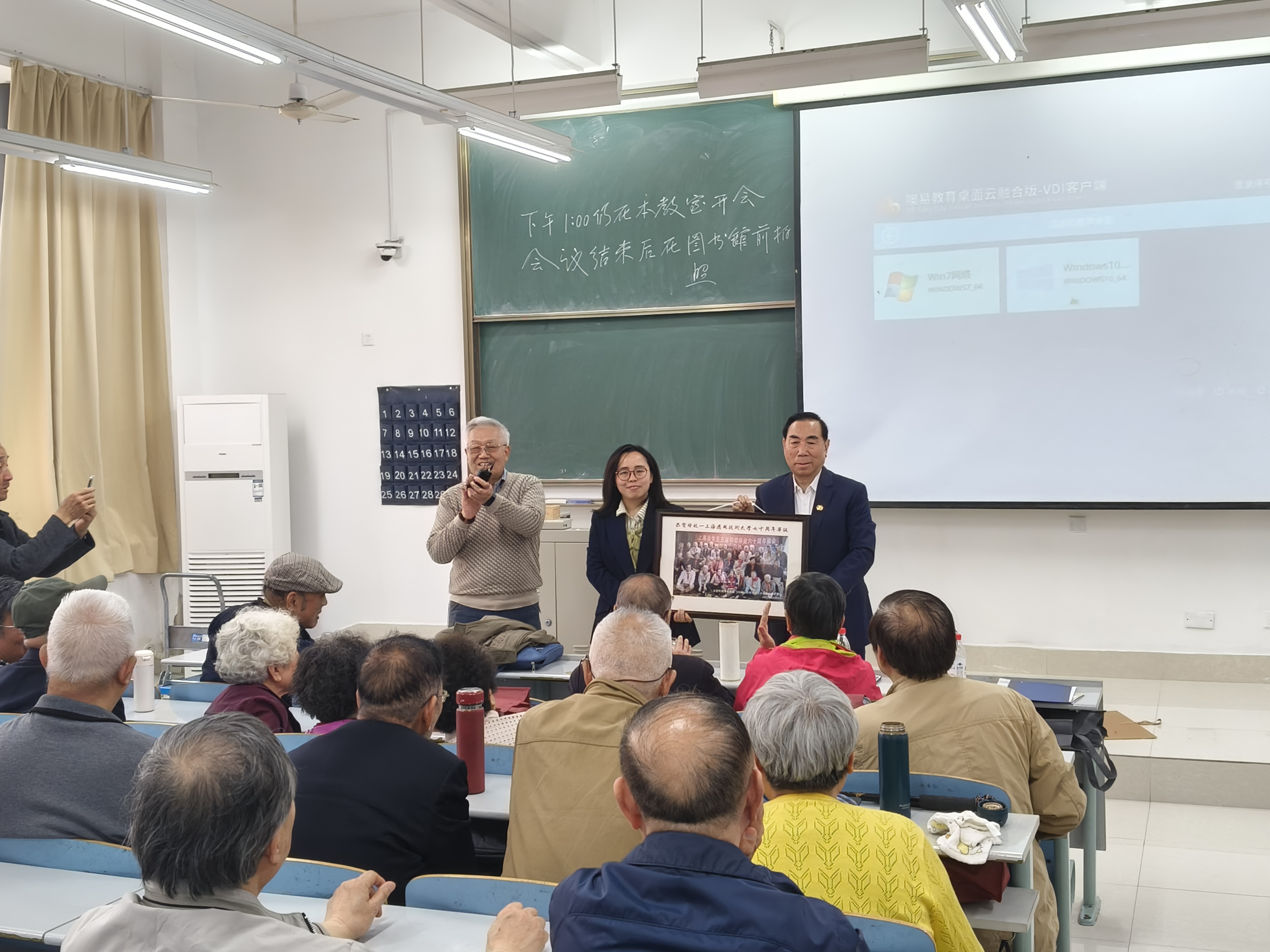 随后,冶专首届校友代表发言。他表示入校时上海冶金高等专科学校仅有一栋教学大楼,现如今母校由各式宏伟、精美建筑的楼、院、馆、舍组成的大学城熠熠生辉。70年的沧桑巨变,作为亲身的经历者和见证人,他们为上海和祖国的快速发展由衷的感到光荣和自豪。座谈会最后,冶专校友代表向学校赠送首届校友60周年合影照。