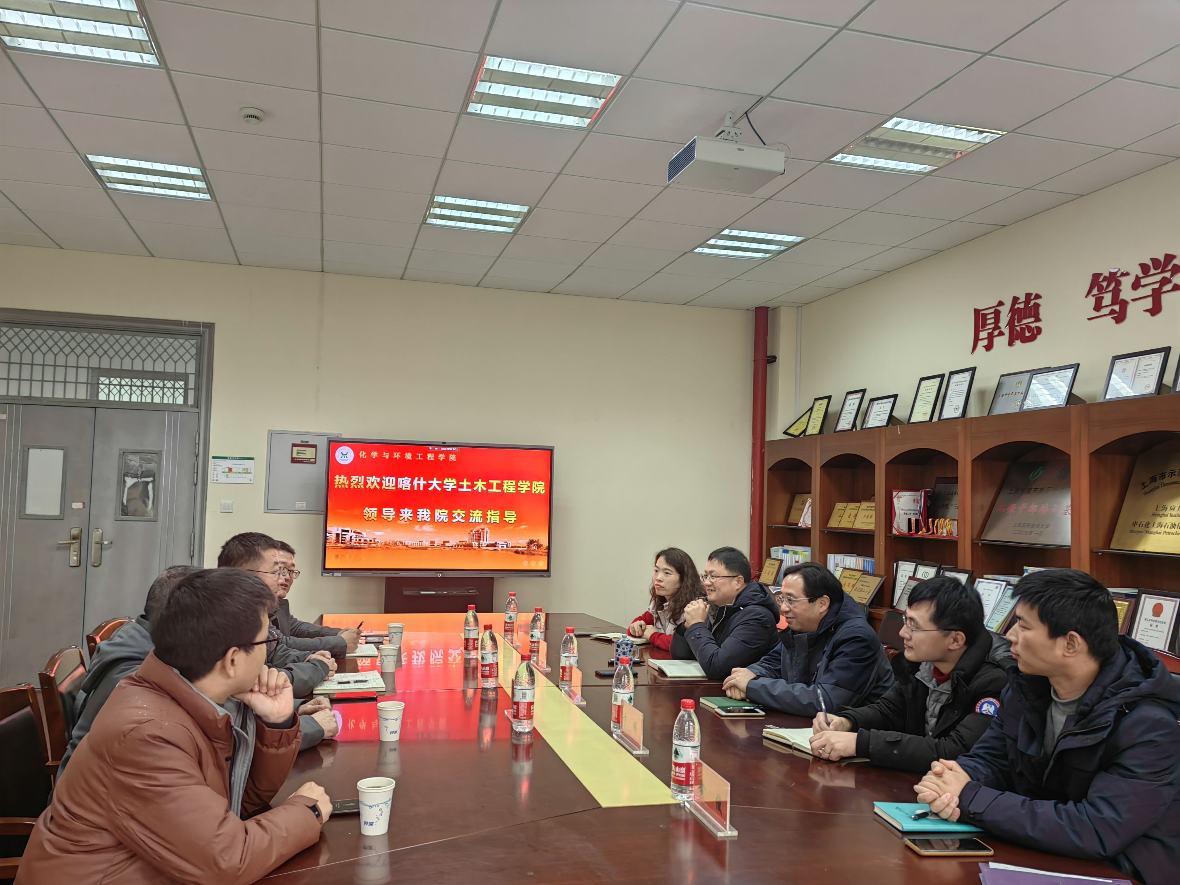 12月18日,喀什大学土木工程学院杨江平书记、马杰院长一行到化学与环境工程学院交流。图书馆馆长(原援疆干部、喀什大学土木学院第一任院长)黄俊革、化工学院院长胡晓钧、化工学院党委书记毛东森等出席。