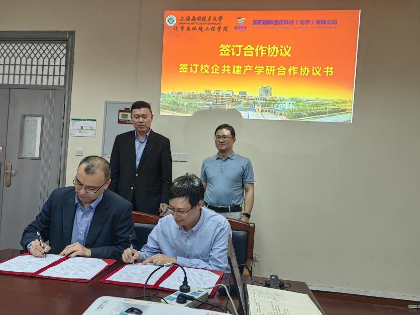 5月15日国药国际医药科技(北京)有限公司与化学与环境工程学院“绿色生物制造联合实验室”签约仪式在奉贤校区第三学科楼举行。中国国际医药卫生有限公司副总经理国际事业部总裁严兵,国药国际医药科技(北京)有限公司总经理袁志法、总工程师杨文,学院院长胡晓钧,副院长卞明、吴晶晶,制药工程专业教授吴范宏、徐毅及教师、学生代表共同出席了此次揭牌仪式。