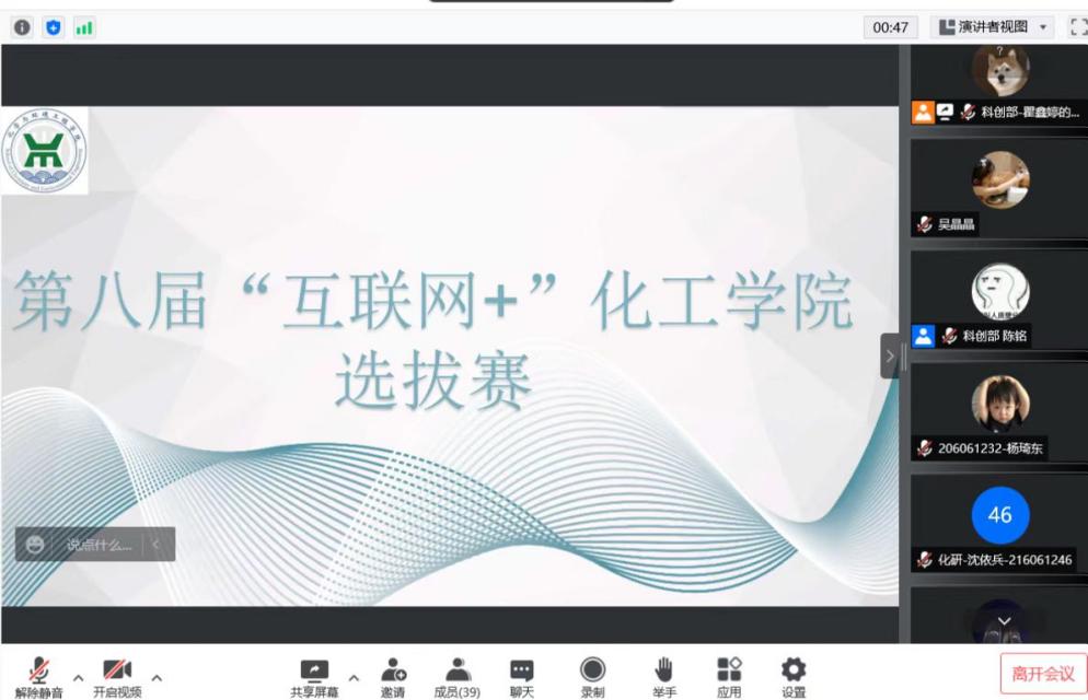 根据学校《关于举办上海应用技术大学第八届“互联网+”校赛通知》要求,化工学院于2022年5月7日启动院内汇报选拔,对所有参赛项目进行线上评审选拔。