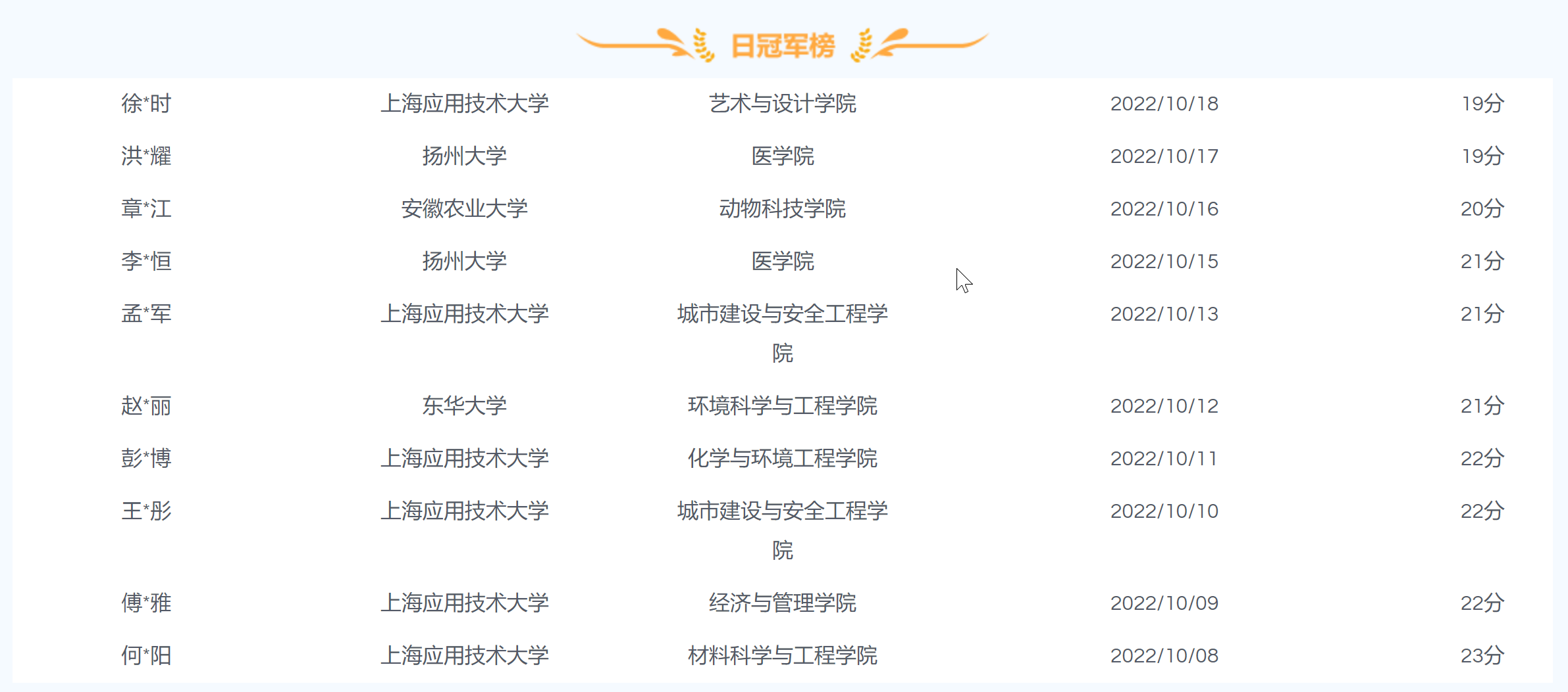为普及实验室安全知识,激发大学生学习实验室安全知识的热情,提高师生实验安全技能,上海市大学生实验室安全知识竞赛组委会于2022年10月8日起再次线上举办上海市大学生实验室安全知识竞赛个人挑战赛。我院201071Y1化学工程与工艺(卓越)班学生彭仕博,在第一周线上答题挑战赛中获得“周冠军”,同时也是10月11日的“日冠军”获得者。