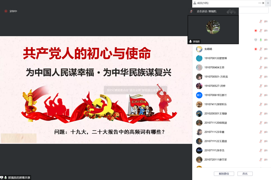 郭强胜老师带领同学们学习了《共产党人的使命和初心》。郭老师强调,只有牢牢把握共产党人的初心和使命,才能不忘来时的路,走好现在的路,开创未来的路。青年学生要牢记“共产党人的使命和初心,就是为中国人民谋幸福,为中华民族谋复兴”。正是这个初心和使命激励着一代又一代的共产党人在为人民谋福祉的路上不懈奋斗。郭强胜老师激励同学们,一定要保持与人民同呼吸、共命运,以永不懈怠的精神状态和勇往无前的奋斗姿态,继续朝着中华民族伟大复兴的宏伟目标奋勇前行。
