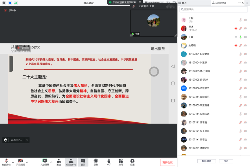 王震书记为大家讲授了《共话二十大》党课,以关键词的形式阐明了二十大报告的主要内容,从党的二十大召开的重大历史意义、大会报告的核心要义、如何学习宣传党的二十大报告精神等方面进行了解读。王震书记强调,要牢牢把握党的二十大精神实质,要把学习贯彻党的二十大精神作为当前和今后一个时期的重大政治任务,切实把思想和行动统一到二十大精神上来,在全面建设社会主义现代化国家、全面推进中华民族伟大复兴的新征程中贡献青春力量。