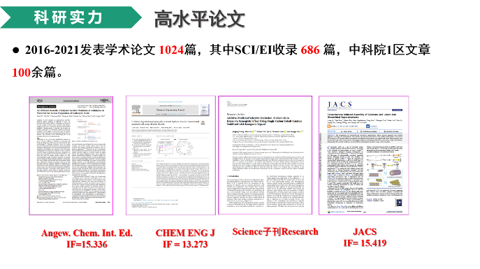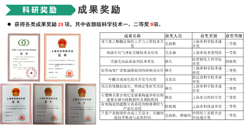 学院注重化学化工领域前沿性和交叉性的重大应用基础研究,科研实力逐年提升,与国内外著名高等院校、科研院所和知名企业共同开展研究生联合培养工作,建有上海化工研究院和上海医药集团两个市级专业学位研究生实践基地,其中上海化工研究院实践基地被评为上海市专业学位研究生示范实践基地。近五年,学院教师共承担国家级项目30余项,国家重点研发计划子课题1项;获省部级成果16项,一等奖4项;科研经费到款总额超1亿元;发表三大检索论文包括Science子系列、JACS、Angew等国际顶尖期刊论文1024篇;获国家专利授权462项。化学、工程学学科进入ESI全球排名前1%,“化学工程与技术”学科整体实力进入全国排名前19%,在上海高校中位列第三。