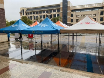 在闭环管控的最后攻坚阶段,天公不作美上海下起了大雨,在寒风中志愿者们无畏风雨,下午两点志愿者们已经搭好帐篷,布置好现场,志愿者们能做的也仅仅只能是让同学们少淋雨。那场雨像是一场洗礼,志愿者们义无反顾的冒雨前行,一队一队的有序检测,耐心的为不会使用智能手机的阿姨进行注册,大家虽不熟悉,只是因为志愿者三个字,让大家保持着高度的默契,高效率的进行检测。在那一刻上应人展现着身为新时代青年应尽的责任。