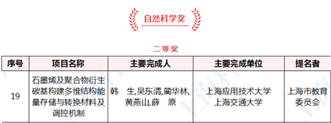 近日, “中国上海”网站公布了《上海市人民政府关于表彰2020年度上海市科学技术奖获奖人员(项目)的决定》,我校再创佳绩,获得4项上海市科学技术奖。值得关注的是,其中2项获奖成果来自化学与环境工程学院,韩生教授主持完成的《石墨烯及聚合物衍生碳基构建多维结构能量存储与转换材料及调控机制》,该成果以上海应用技术大学为第一完成单位获得上海市自然科学奖二等奖;此外,陈桂娥教授与上海赛奥分离技术工程有限公司等合作完成的《荷电陶瓷纳滤膜分离系统的精准调控与产业化应用》获上海市科技进步奖二等奖。