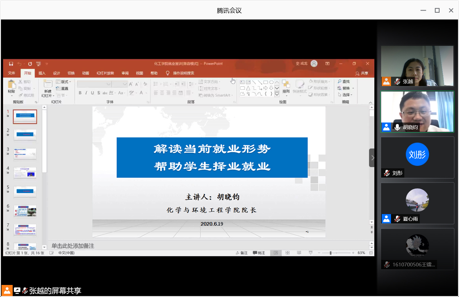 为进一步加强对学生的就业指导,尤其是对就业现状和就业目标的清晰认知,2020619日上午930分,化学与环境工程学院院长胡晓钧通过腾讯会议为大四毕业生开展了一场别开生面的就业指导讲座,会议由张越老师主持。