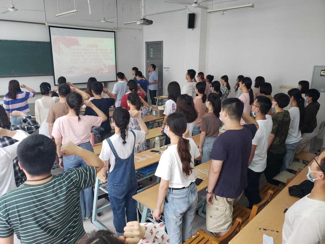 毕业生党员离校主题教育活动以全体党员集体宣誓的方式拉开帷幕,由领誓人仇彦崴带领,在鲜红的党旗下,全体党员佩戴党徽,举起右手、握紧拳头,庄严宣誓。通过组织党员开展重温入党誓词行动,让党员重温入党宣誓时的庄严承诺和坚定决心。