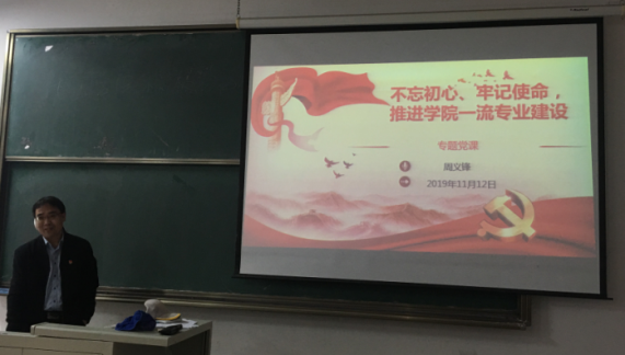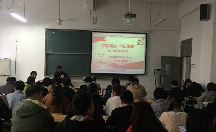 20191112日,化工学院开展了“不忘初心、牢记使命”专题党课,讲课老师有化工学院党总支书记孙小玲、化工学院副院长刘振江、周义锋,化工学院教职工党员及学生党员出席听课。