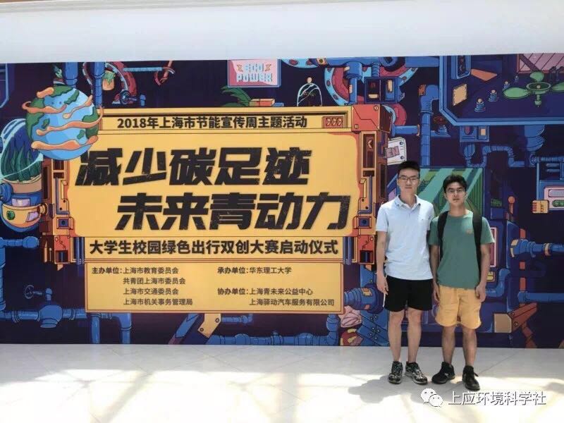 2018年6月13日,我校隶属于化学与环境工程学院的环境科学社受邀参加由市教委、团市委、交通委、机管局共同发起,华东理工大学和青未来公益中心承办的2018年上海市节能宣传周教育系统主题活动“减少碳足迹•未来青动力”大学生校园绿色出行双创大赛启动仪式,我社主要成员温焱、吴子安、舒健禛同学作为社团代表参与了此次活动。