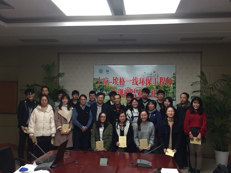 20171123日,在图书馆B103开展了上应-埃格一线环保工程师培训班结业典礼,本次典礼共持续3个多小时,我校副校长、环境工程学科带头人陈东辉、我校化工学院党总支书记孙小玲、副院长、副书记陈静、上海市城建总院副总工黄瑾、奉贤区环境监测站站长翁振华、环境工程系朱勇强教授级高工、胡宏韬副教授、夏卫红讲师等出席了本次结业典礼。共有17位来自环境和给排水专业的同学参与了本次结业典礼。